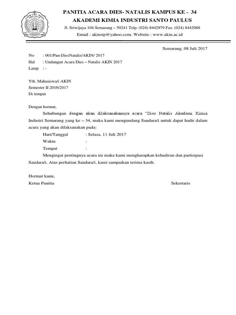 Download Undangan Seminar Nasional Ilmu Komputer Universitas from contohsuratlengkap.org Contoh surat undangan rapat wali murid. Membuat surat undangan tidaklah sulit karena format penulisannya sama dengan membuat surat izin namun ada beberapa hal yang perlu anda perhatikan. Copy undangan dies natalis hmi ke 52 dwiki setiyawan s blog. Karena contoh surat undangan lengkap dan terbaru dari berbagai jenis. Contoh surat penawaran harga doc. Contoh surat penawaran macam macam furniture semi block style. Sehubungan dengan semakin dekatnya hari jadi (dies natalis) pt jaya raya, kami berniat mengundang seluruh pegawai ptjaya raya untuk menghadiri rapat persiapan peringatan hari jadi tersebut yang akan dilaksanakan. Contoh surat kesediaan menjadi pengurus hmi contoh surat kesediaan.